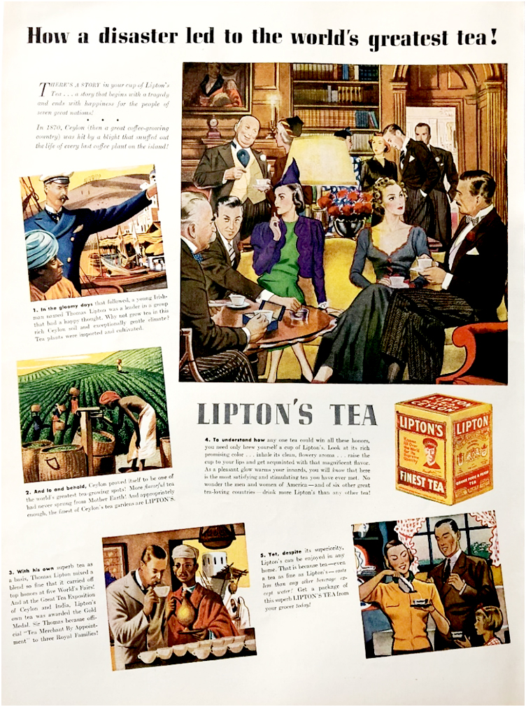 Closely examine the 1938 advertisement for Lipton tea located HERE. What do you think is its purpose? What does each section contribute to the overall effect? How are the identities of Ceylon and Lipton tea intertwined in this ad? How does it make use of the “exotic” qualities of Ceylon? How is Ceylon and European society contrasted? Note: The impression that Lipton was one of the first to begin growing tea in Ceylon, as the ad implies, is incorrect. Lipton did not purchase his first tea plantation in Ceylon until 1890; at that time tea accounted for more than 75% of Ceylon’s highland exports.